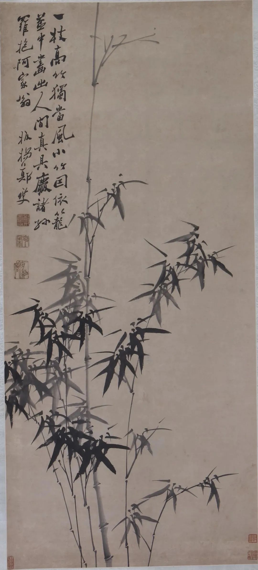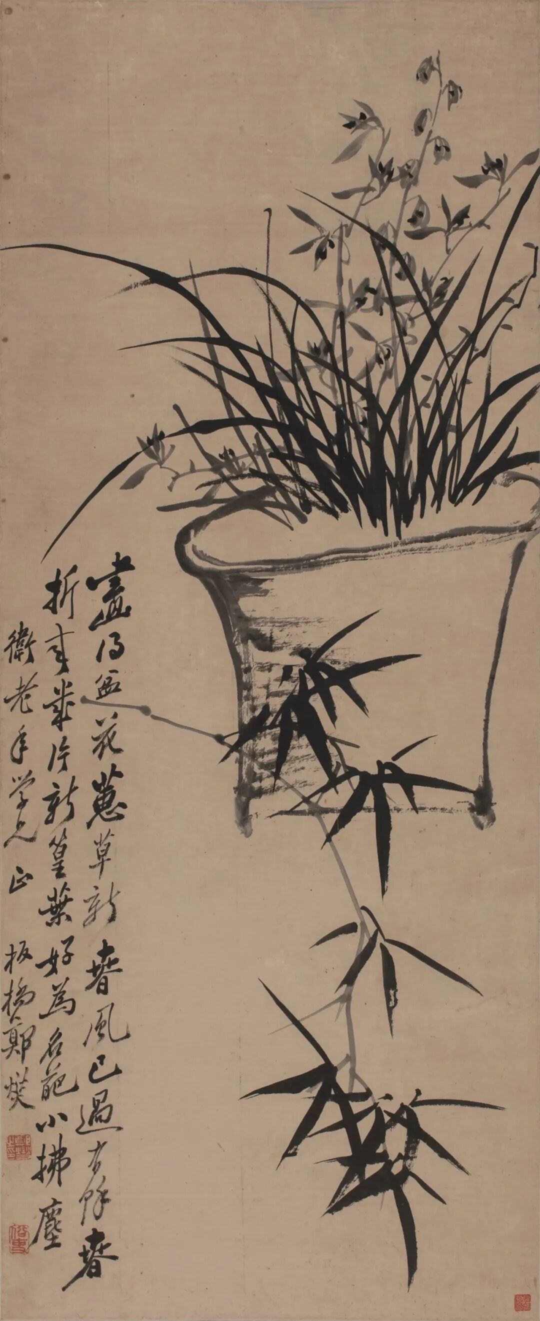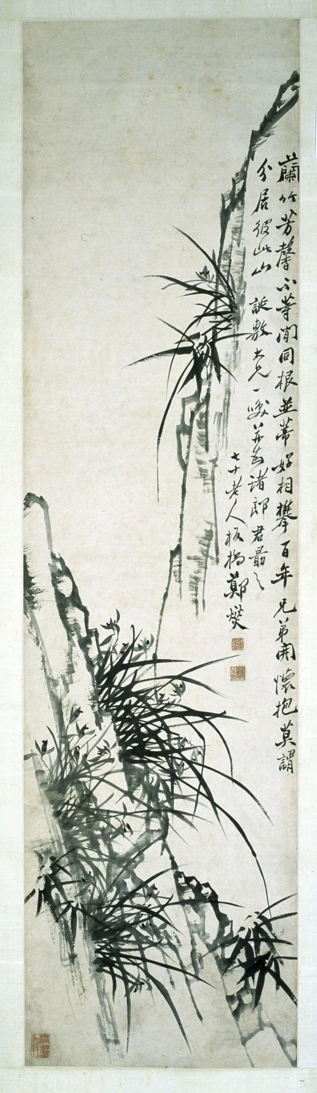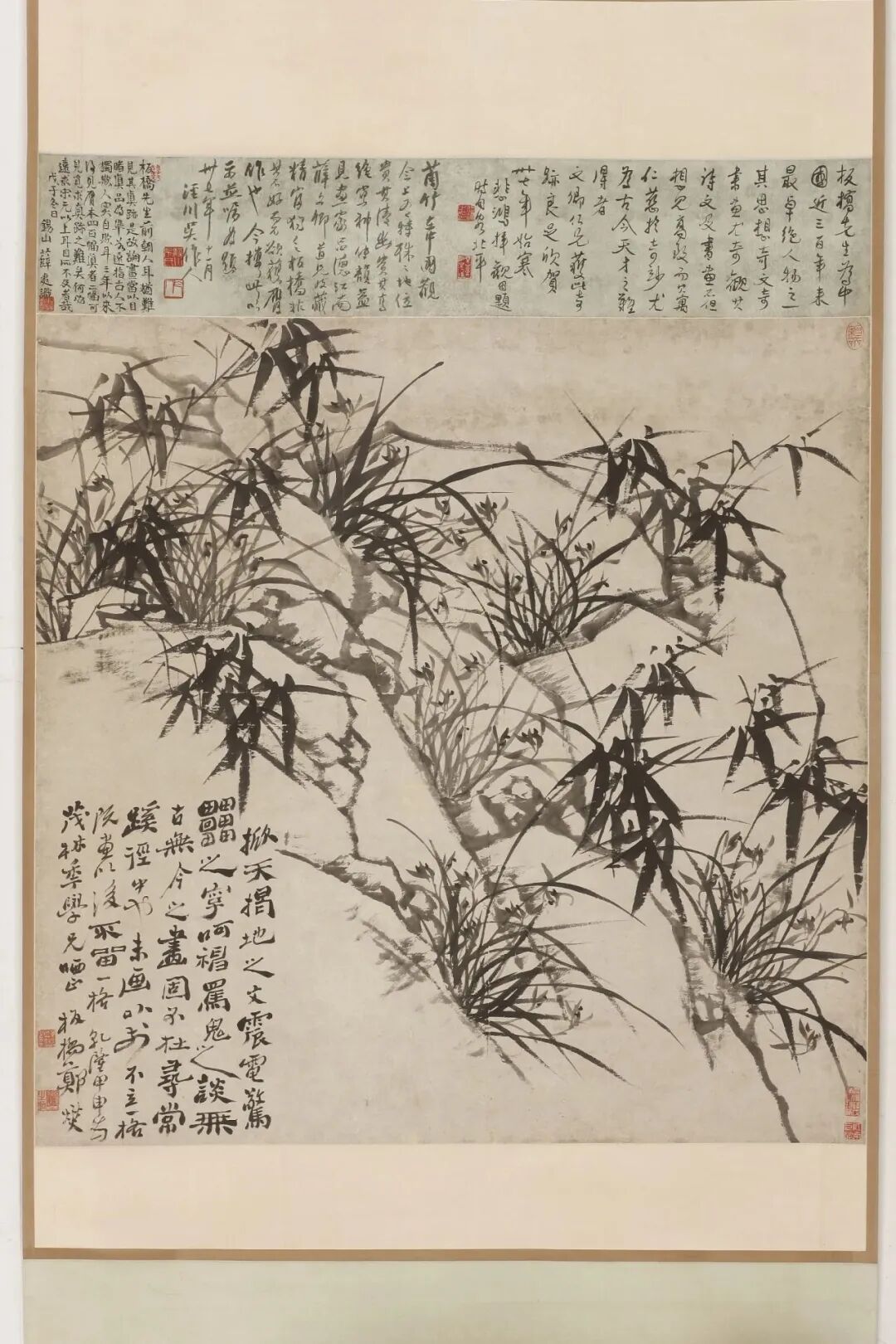作于乾隆甲申(1764),二级文物。图中石突兀,少皴擦,无点苔,似十分坚硬。石缝间兰竹丛生分披,繁而不乱,阴阳向背,层次分明。竹叶少而肥,苍翠清秀;幽兰吐蕊,花朵如蝴蝶纷飞。整图生机蓬勃,意趣横生。左下侧有其“六分半书”自题:“掀天揭地之文,震电惊雷之字,呵神骂鬼之谈,无古无今之画,固不在寻常蹊径中也,未画以前,不立一格,既画以后,不留一格”,这段文字既是画论,也是自况。诗堂处有徐悲鸿、吴作人和薛满生之跋。
